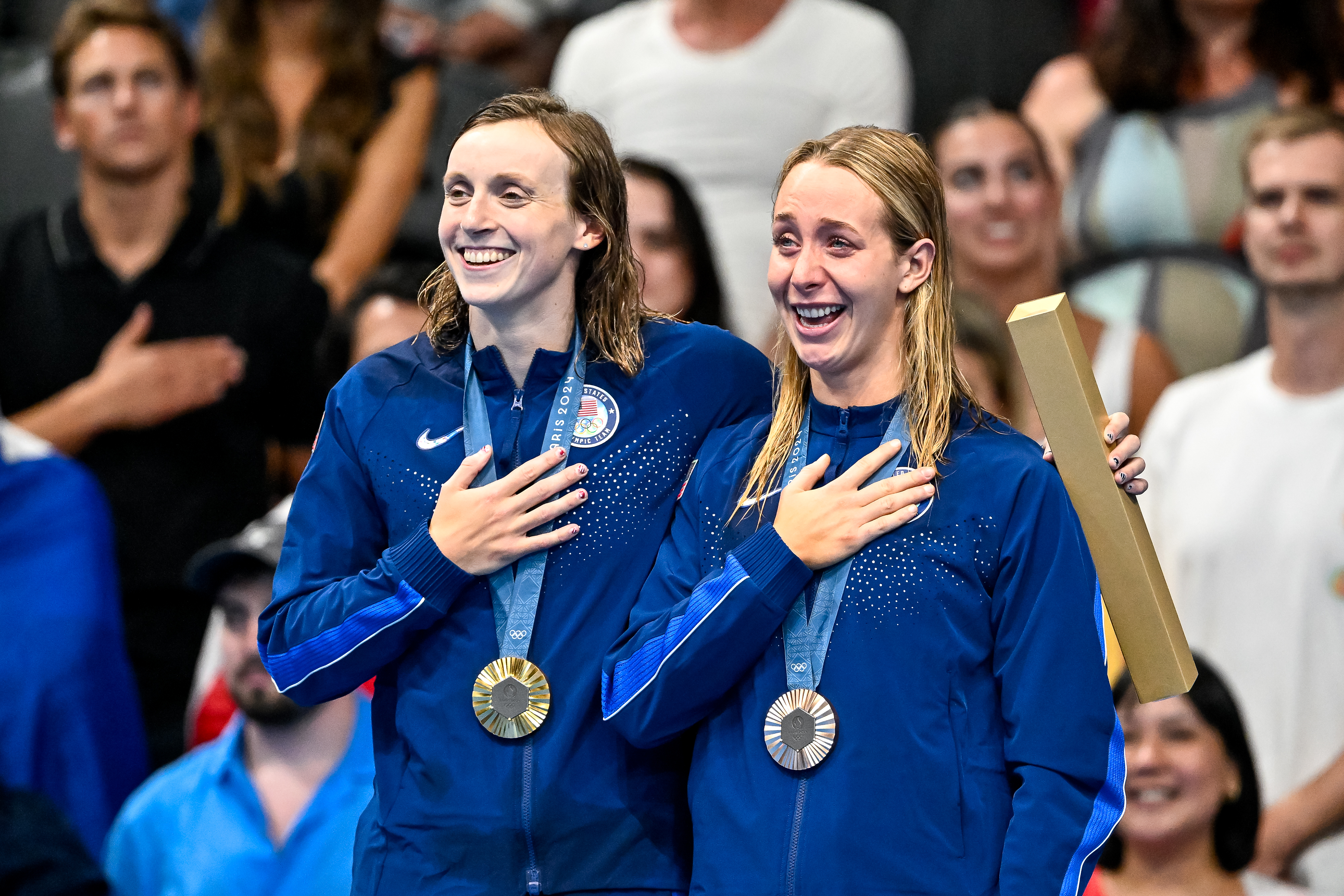 Team USA swimmers Katie Ledecky (left) and Paige Madden (right) attend the medal ceremony of the women’s 800-meter freestyle swimming final on Aug. 3, 2024