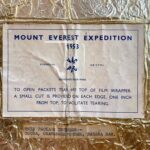 Formerly holding cocoa, orangeade powder, and a banana bar, the open foil food packet bears the faded signatures of Colonel John Hunt, the British expedition’s leader, and two of his famous fellow climbers, New Zealander Edmund Hillary and Nepali-Indian Tenzing Norgay.