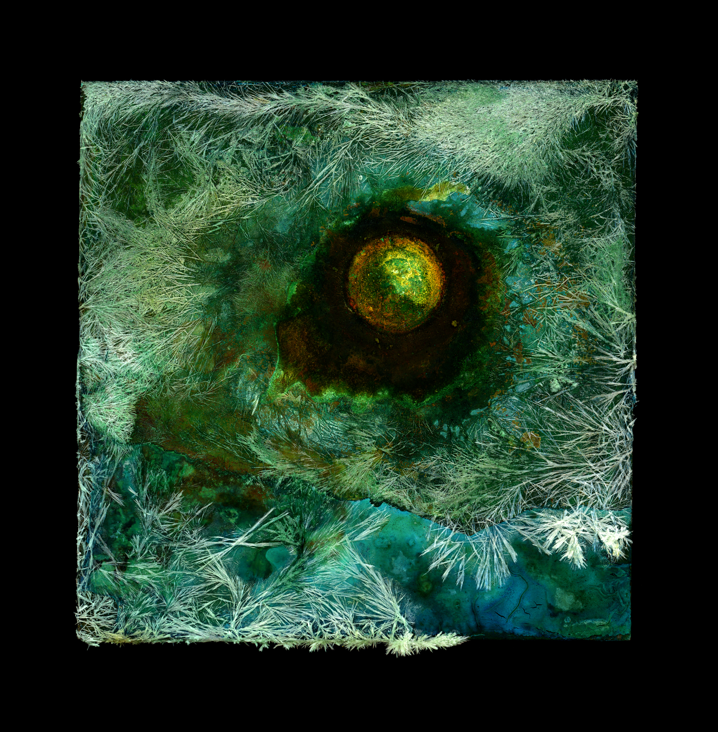 A copper plate distressed and oxidised by everyday household materials. “The fragments of flotsam and jetsam that formed the source of my medium have been replaced with the chemical fragments of common household materials — bleach, cleaners, gardening products, bathroom products. This image is made on a glass plate and captured with a scanner,” said Kenny.