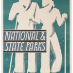 In 1934, the park service began to actively promote state and national park tourism by designing their own promotional posters to be displayed at local railroad and bus stations and hotels. In one of its 1934 Park Bulletin newsletters, the organization explained: “With the aid of State Park Emergency Conservation Work Funds, it has been possible for the Service to have printed for distribution to tour bureaus, railroads, schools, travel clubs, etc., a set of six colorful posters depicting national park scenes. Miss Dorothy Waugh, a New York artist, sketched the posters and they were printed by the Burland Printing Company of New York City under contract let by the Government Printing Office.”