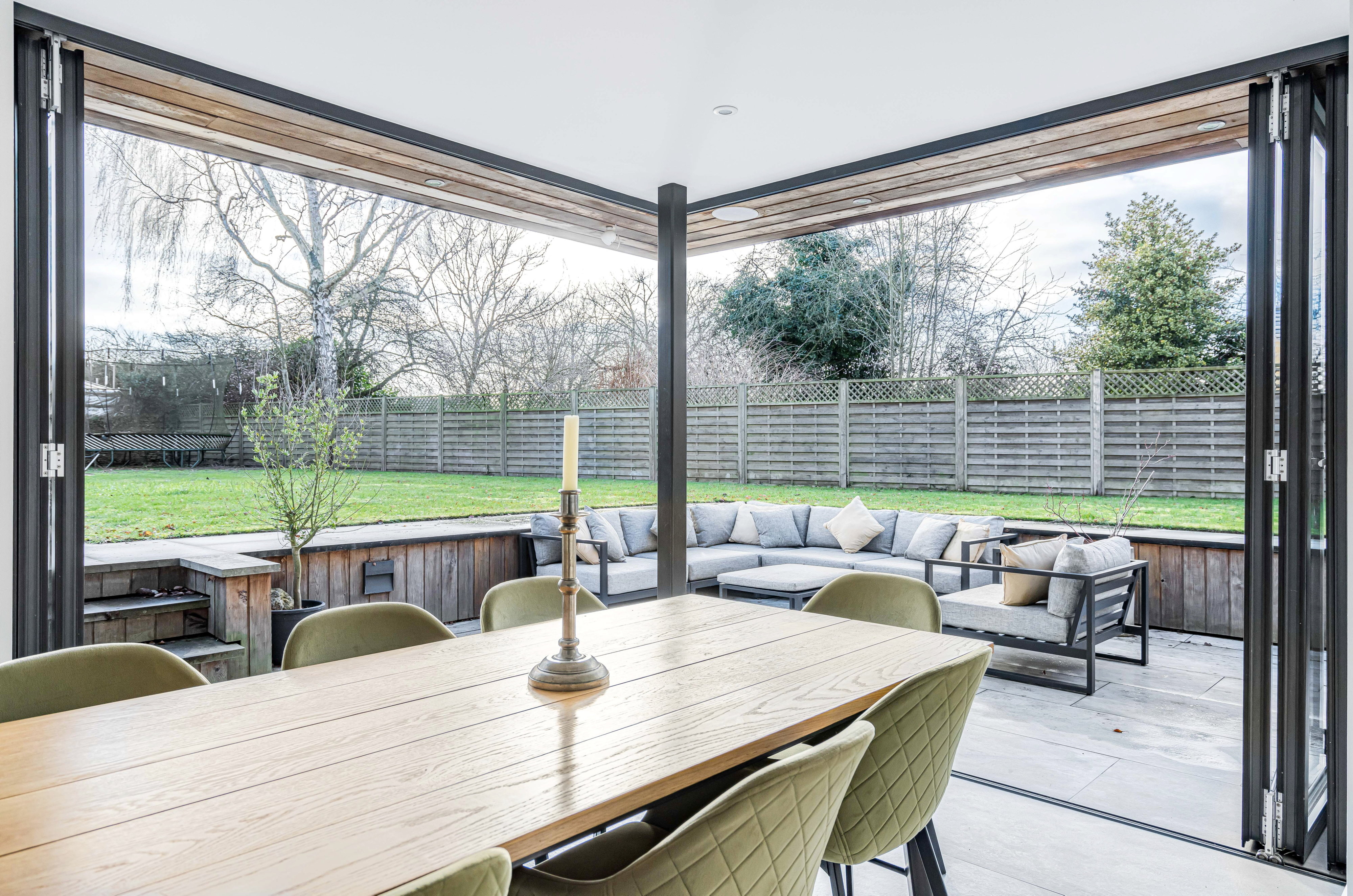 There has been a full restoration to the property, including contemporary-style bathrooms and a modern extension that created a family kitchen with bifold doors. But despite the upgrades, the house still retains its character with sash windows, exposed beams, and a wood-burning stone fireplace in the living room.