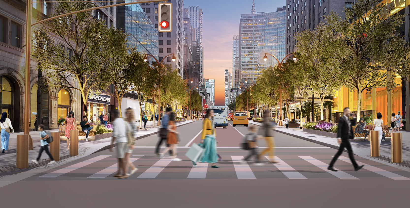 Renderings for the makeover, the first of its kind in the avenue’s 200-year history, were unveiled earlier this month. Proposed improvements include widening sidewalks by nearly 50%, shortening crosswalks and adding lights for increased safety, reducing the number of traffic lanes from five to three, and installing more greenery. The schematic designs are expected to be completed by summer 2025.