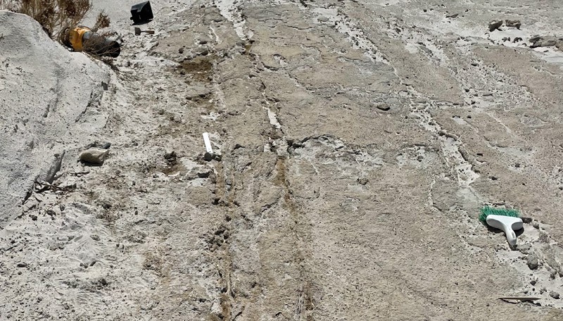 A pole or poles used in this fashion is called a travois. These drag-marks are preserved in dried mud that was buried by sediment and revealed by a combination of erosion and excavation. The drag-marks extend for dozens of meters before disappearing beneath overlying sediment. They clip barefoot human tracks along their length, suggesting the user dragged the travois over their own footprints as they went along.
