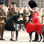 In England, women in the royal family hand out shamrocks to the Irish Guards each St. Patrick’s Day, a tradition that began in 1901, per Town & Country magazine. Princess Kate has had the honor nine times. As seen here in 2019, she also presents the Guards’ mascot — a position currently held by an Irish wolfhound named Domhnall — with one of the green sprigs.