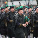 The New York City St. Patrick’s Day parade is said to be one of the largest and oldest in the world. Here, members of a police band march through the city while playing bagpipes.