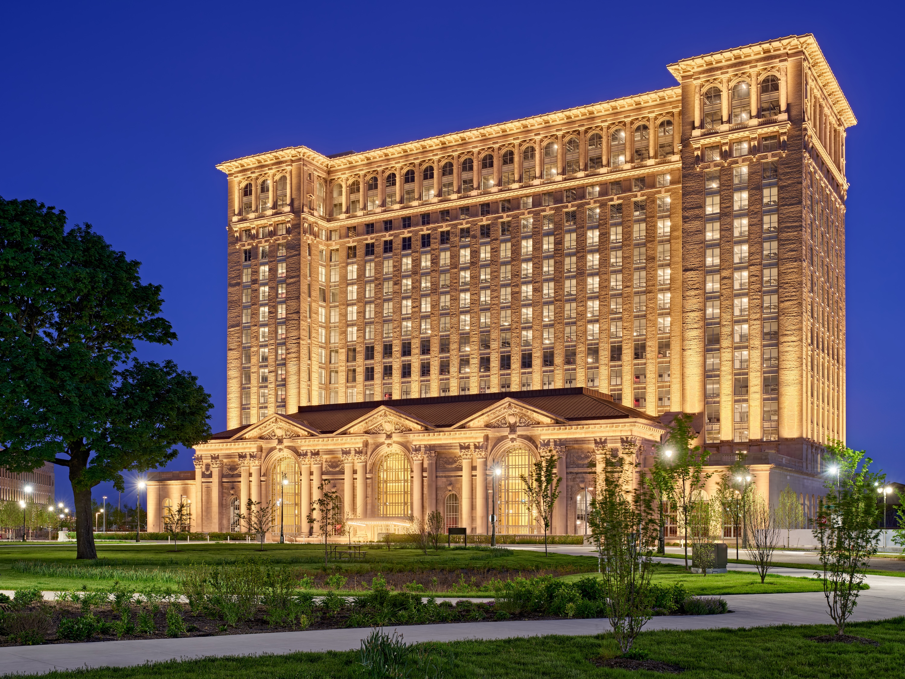 Today, the revitalized structure is a testament to Detroit’s remarkable comeback following a prolonged period of economic hardship: Sitting in front of a 13-acre park, it serves as a beautiful workspace for various companies, featuring artfully reconstructed architecture and decor.