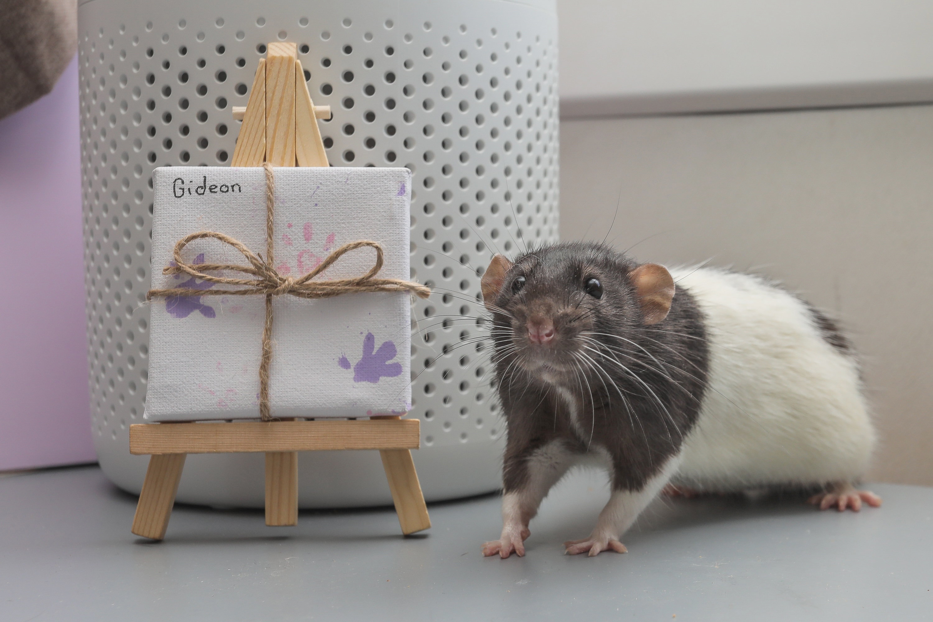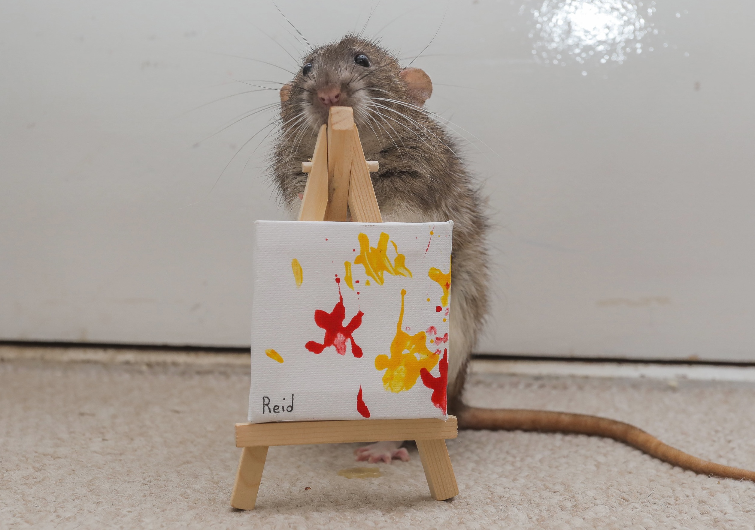 Woodland started joining Facebook groups to learn how to care for her furry friends, and in one of the groups, members kept posting content made by TooGoods Tiny Paws. Feeling inspired, Woodland set up a “studio” for her rodents, which included a playpen, set of watercolors, and jar of baby food to tempt them across an easel. As the rats ran through the paint at Woodland’s encouragement, their paws created colorful, if abstract, pieces on mini canvases.