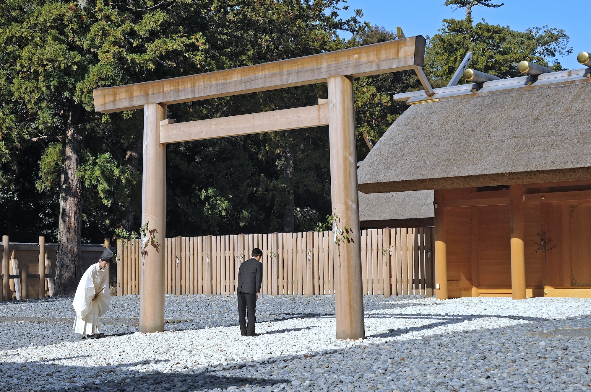 The process begins with the harvesting of sacred timber, which takes place under the supervision and blessing of priests. Cypresses are specifically planted for the construction, many of which outlive the humans who plant them. After asking the mountain deities for permission to fell the ancient trees, the workers then bow and pray together.