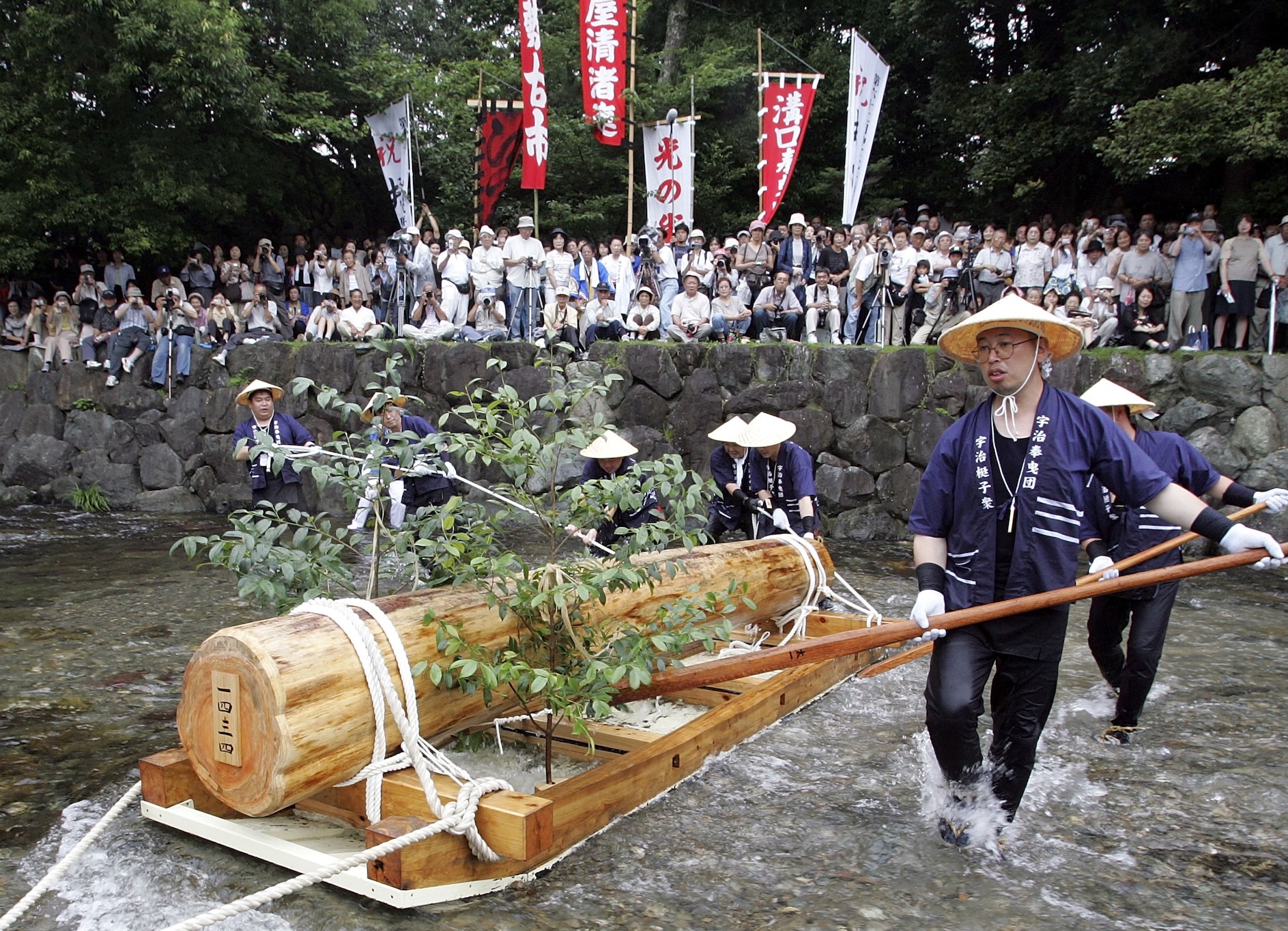 People in traditional dress pull wood along the Isuzu River to the inner shrine of Ise Jingu during the 62nd Okihiki-Gyoji ceremony on July 23, 2006