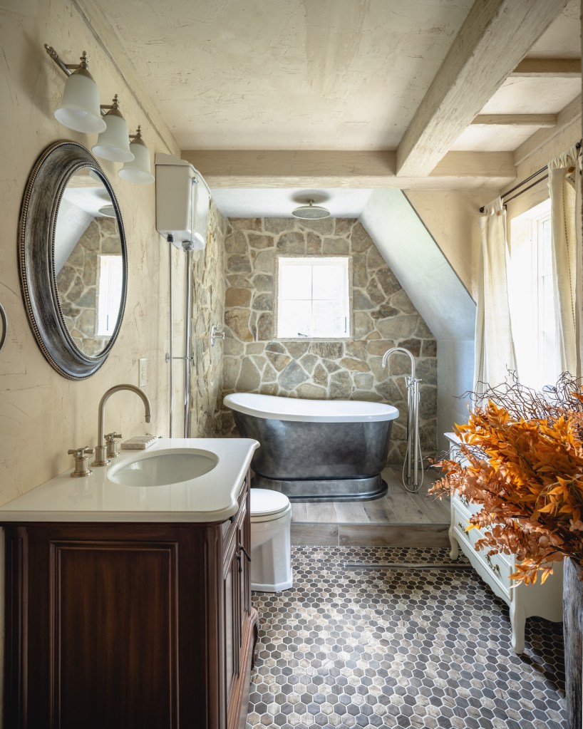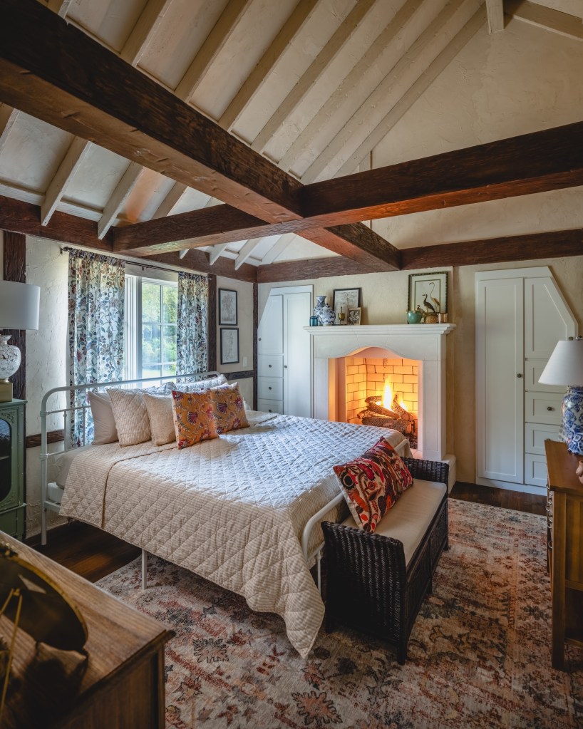 The upstairs boasts two bedrooms with king beds and a bathroom that features a freestanding tub sitting against a stone wall under a small window, just like the one Diaz’s character bathes in. “I love how accurate it is,” Small shared with Country Living. “It is easy to forget this is a new house.” There’s also a pull-out sofa bed, so in total, the cottage sleeps six.