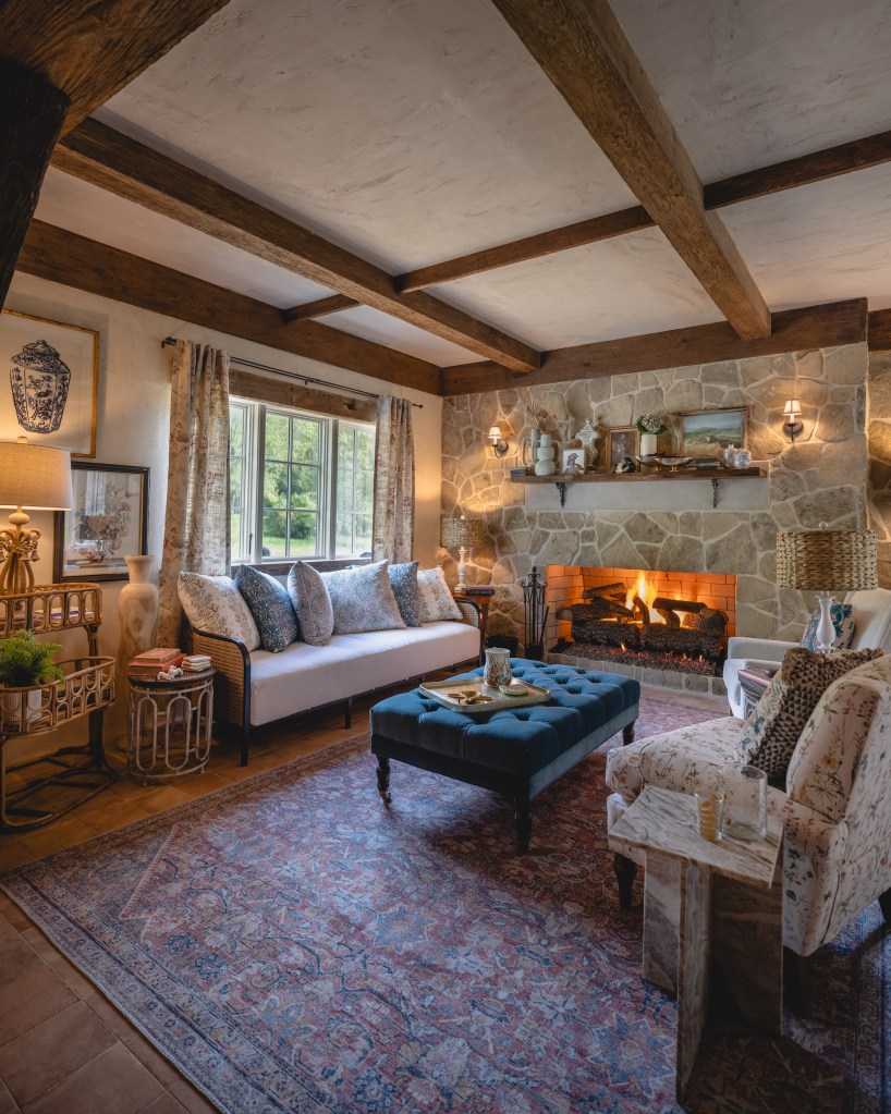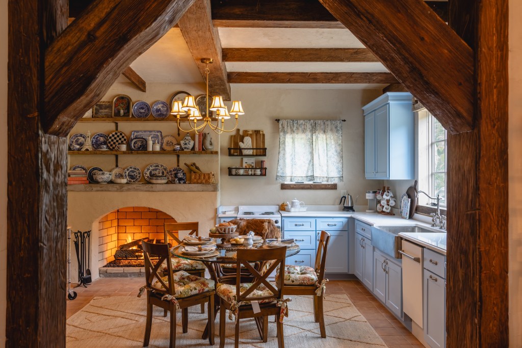 As for the interior walls, Small had to combine sheetrock compound with paint to achieve the same look as the cottage in the movie, since British-style plaster and limewash aren’t typically sold in the U.S. To create wood beams that looked like they’d been hand-hewed in the 17th century, Small’s construction team pounded each board with paper bags filled with gravel rocks, she told the outlet.