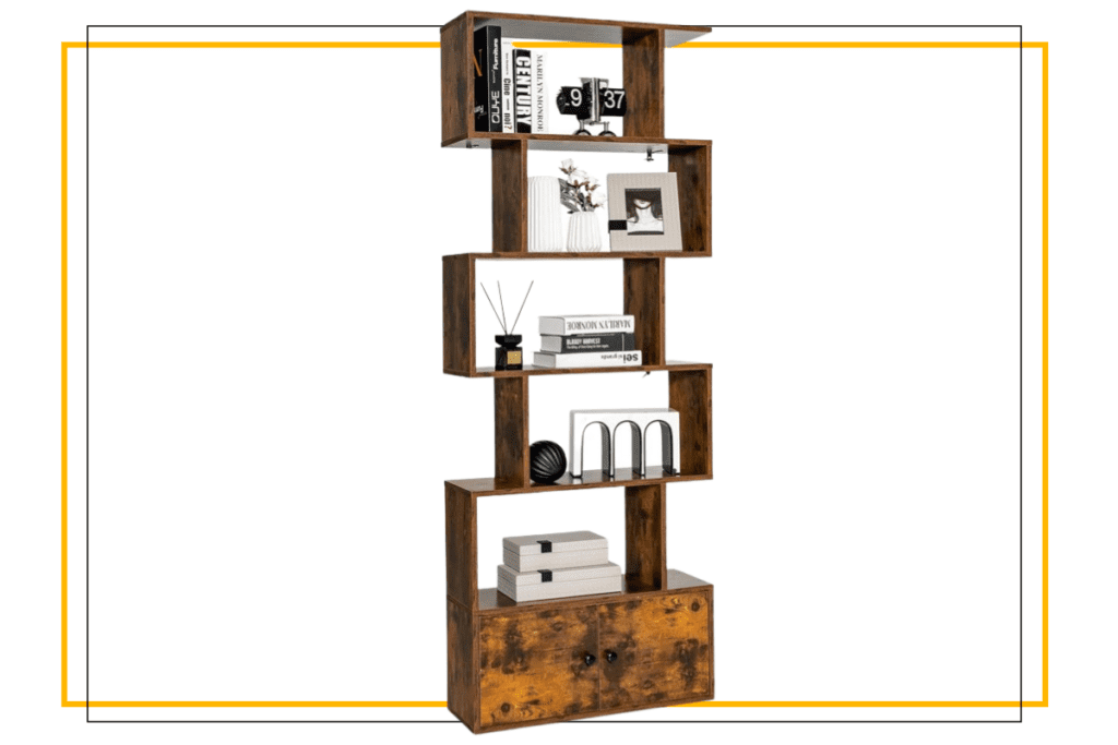 If you’ve got a small space, a tall bookcase that maximizes storage while not taking up a ton of area can do wonders, and open shelves also help in making a room feel spacious. This six-tier, geometric style includes a bottom cabinet for stowing items out of sight, and it comes with anti-tipping devices to secure it to your wall.