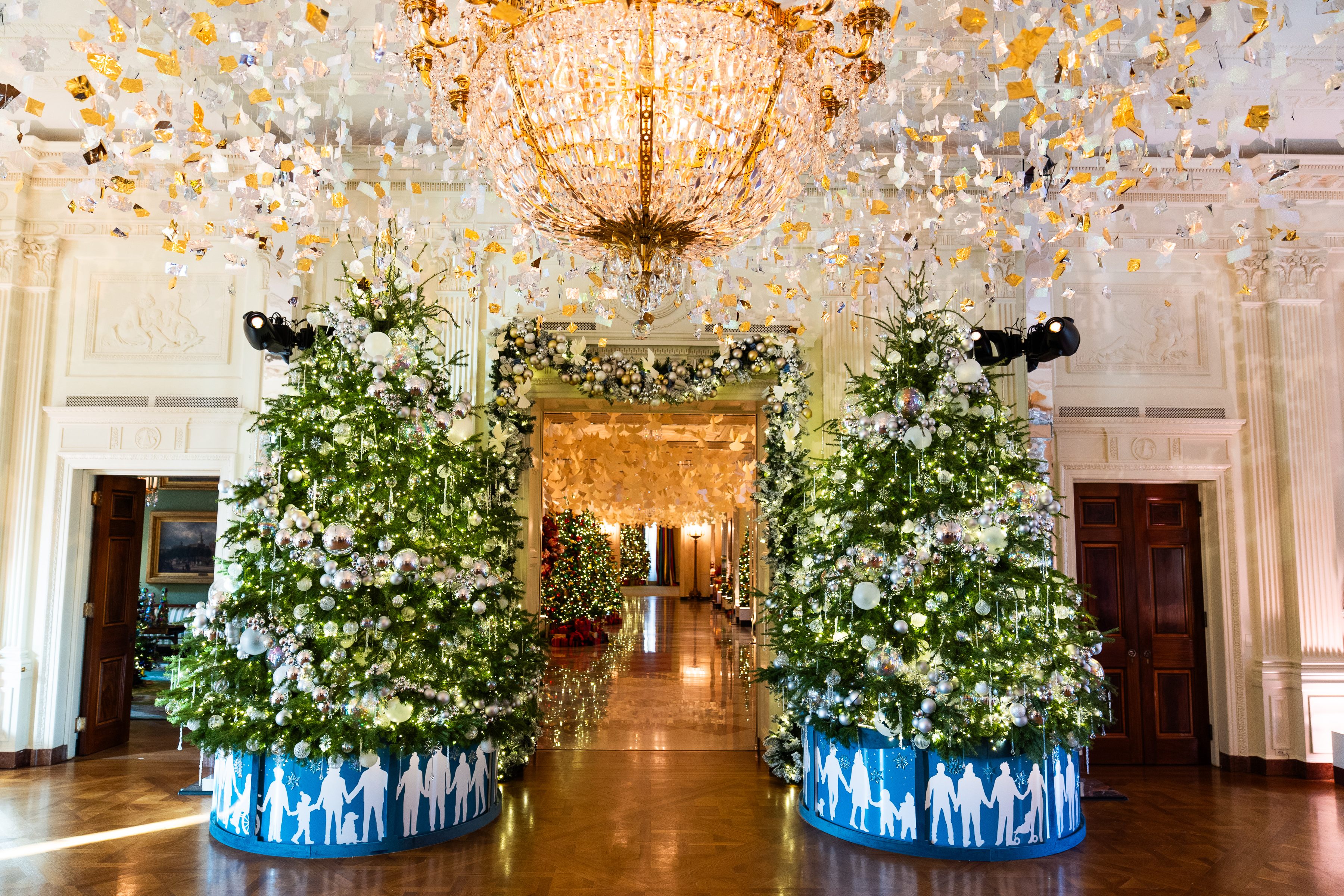 Today, however, you’ll find no such frugality — or boisterous cotton ball chucking. A tour of this year’s elegant decorations takes guests past the Gold Star Tree (representing all six military branches), through the suspended sleigh bells in the East Colonnade, and underneath the tranquil imitation snowfall in the East Room.