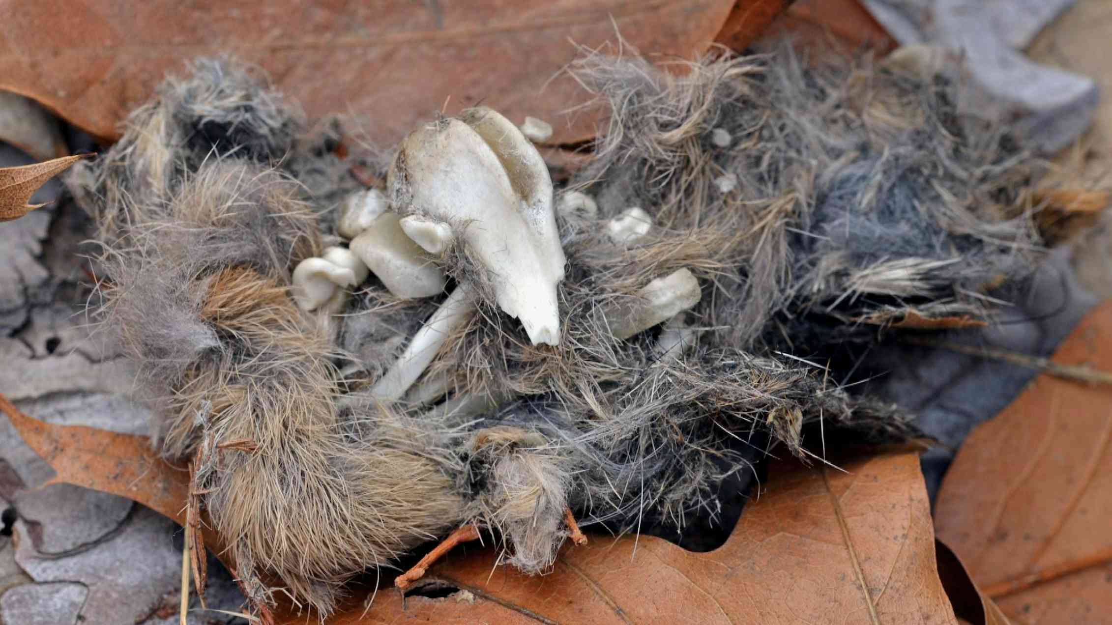If you are lucky, you might find a pellet of bone and fur regurgitated by an owl near the base of a tree. Carefully break it apart and there’s a good chance you’ll find the skull of a vole or rat.