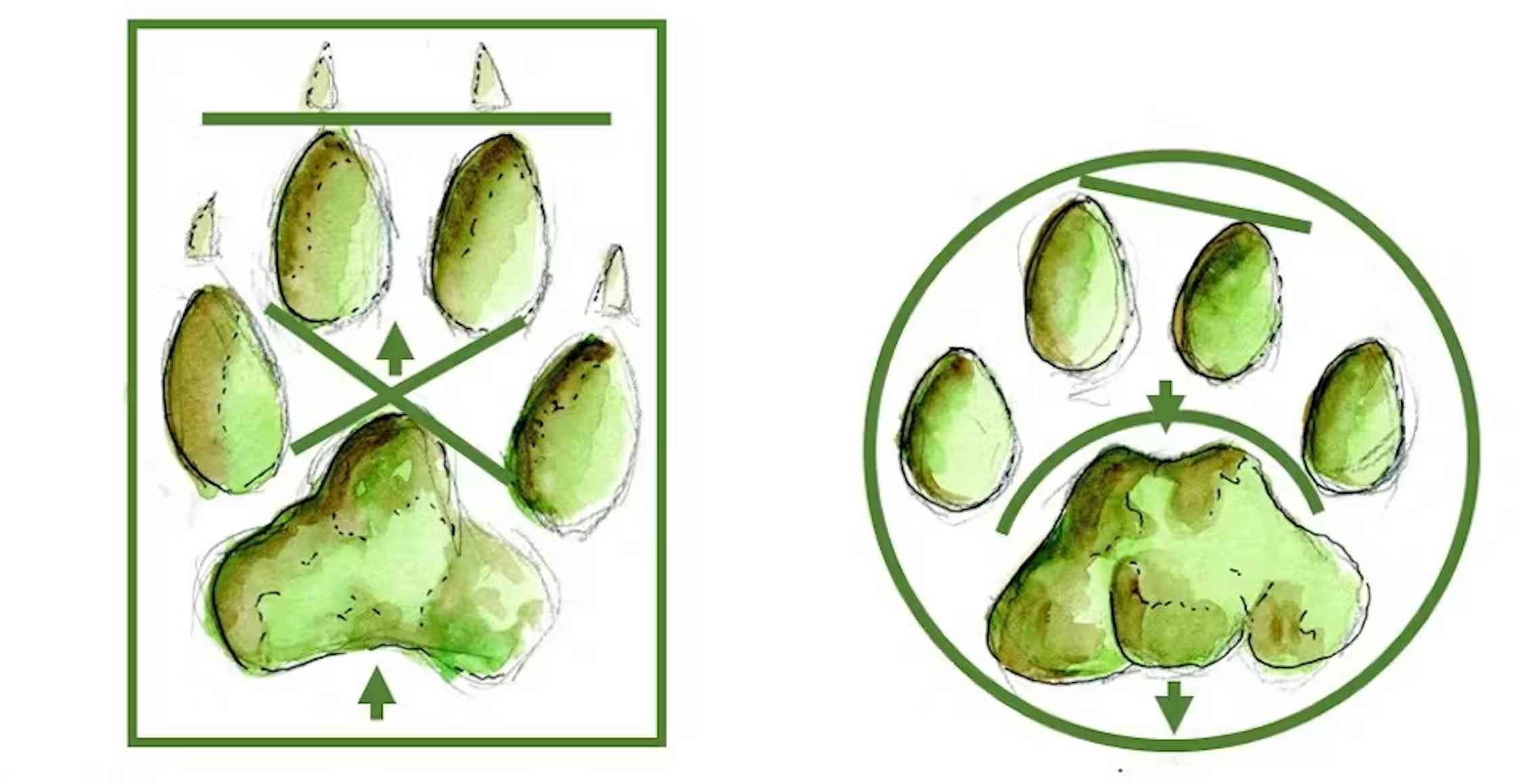 The dog family, including coyotes and foxes, can be differentiated from the cat family by the shape of their palm pads — triangular for dogs, two lobes at the peak for cats.