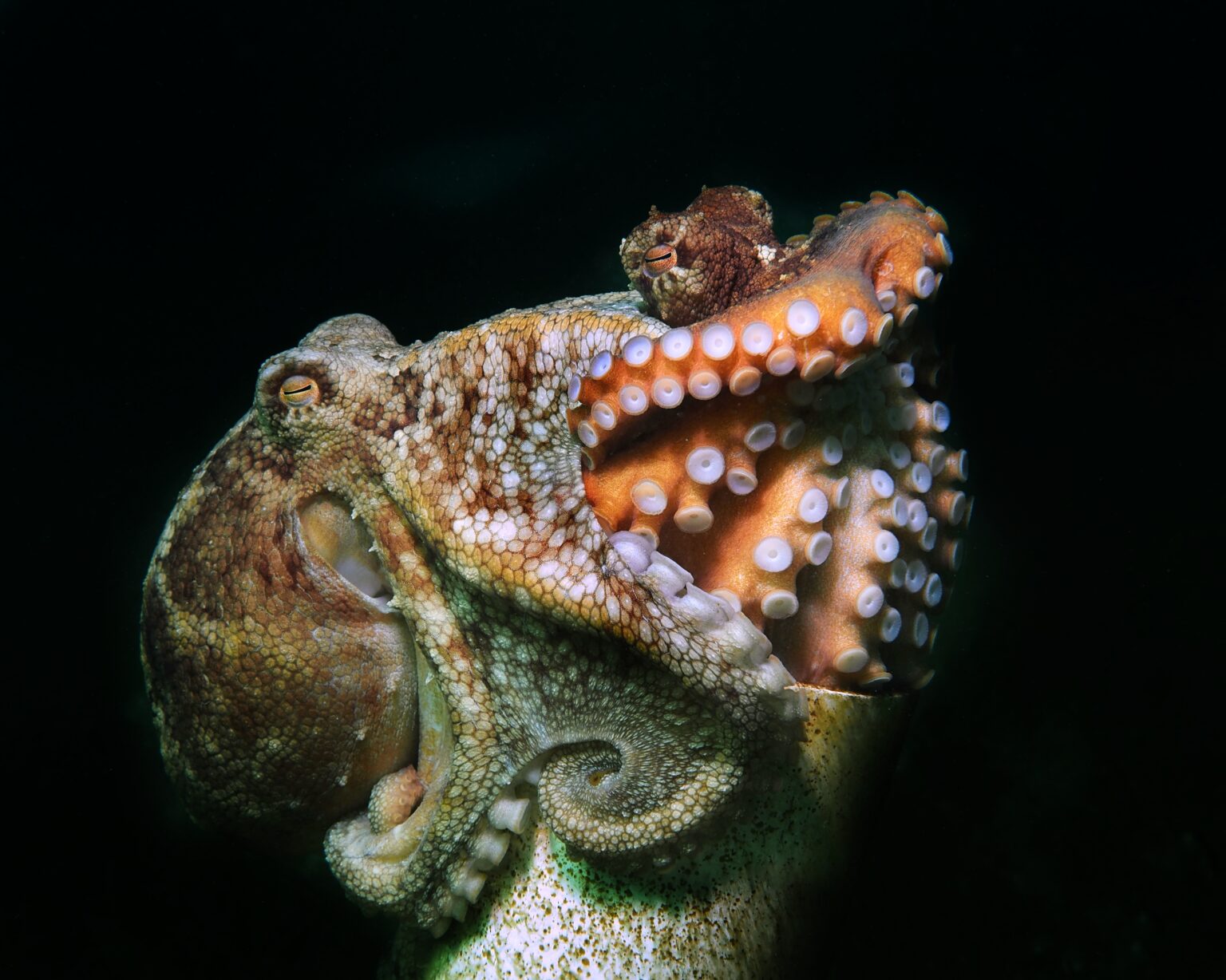 Marine biologist Jialing Cai earned the 2023 grand title for her captivating shot of a paper nautilus — an unusual type of octopus — floating on a bit of debris after a volcanic eruption in the Philippines. It was taken on a blackwater dive, meaning during the night, using high-powered light sources that simulate the moon and attract sea life.