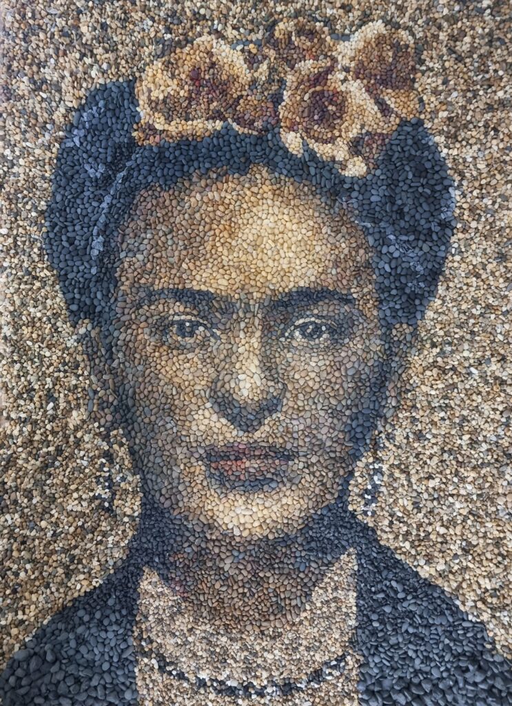Masterpiece is no overstatement when it comes to Bateman’s compositions. A massive likeness of Frida Kahlo, for example, might be mistaken for a painting rather than an arrangement of rocks, if one were to squint their eyes at a photo of the portrait. The shading of her lips is that subtle, the expression in her eyes that uncanny.