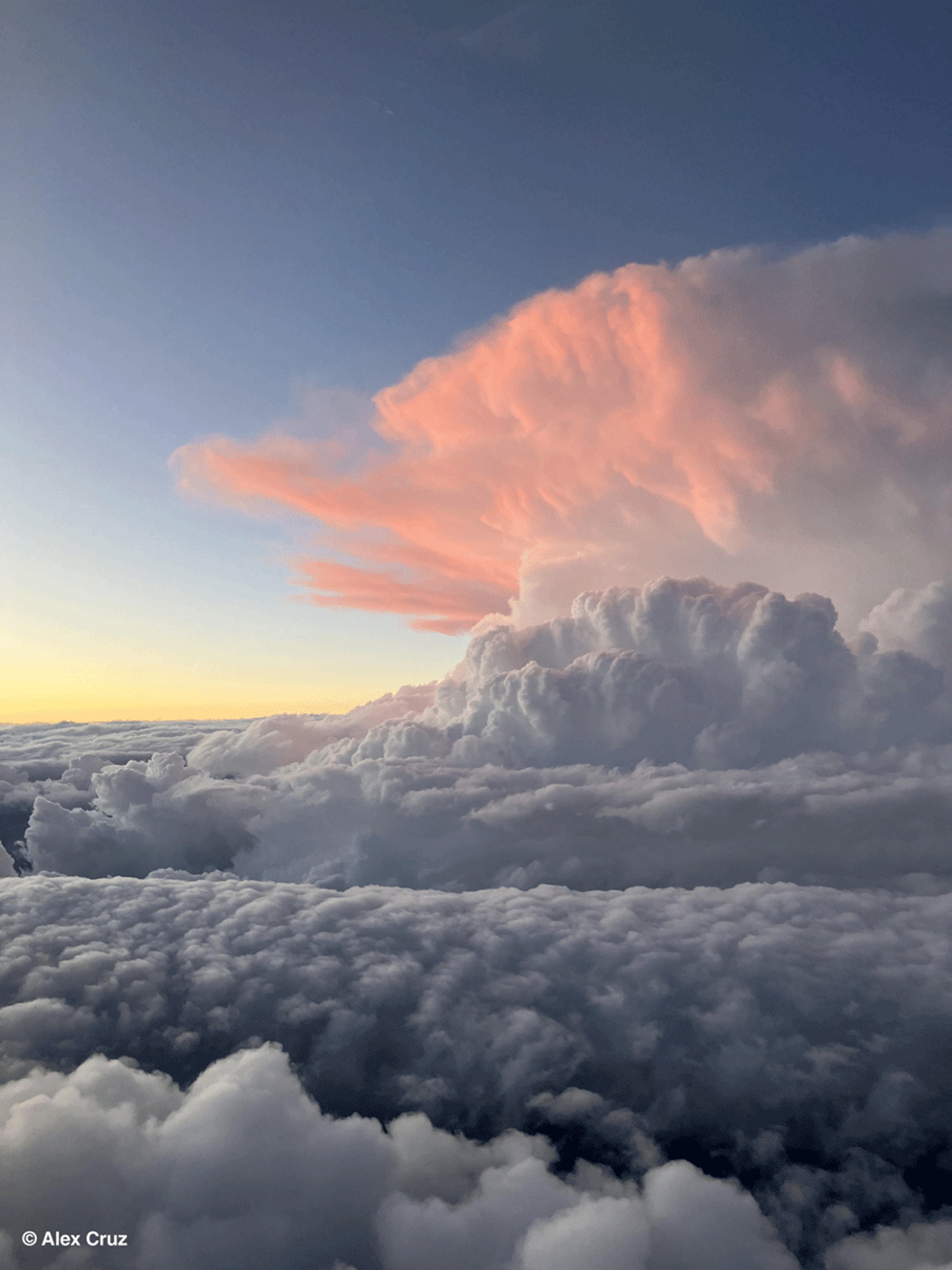 “Captured from a passenger plane flying between Washington, D.C. and Orlando, Florida, this photo reveals a spectacular view of a thunderstorm cloud glowing pink against a deepening blue sky. ‘We were flying alongside a lightning storm, which was a pretty cool sight,’ says young photographer Adrian Cruz.