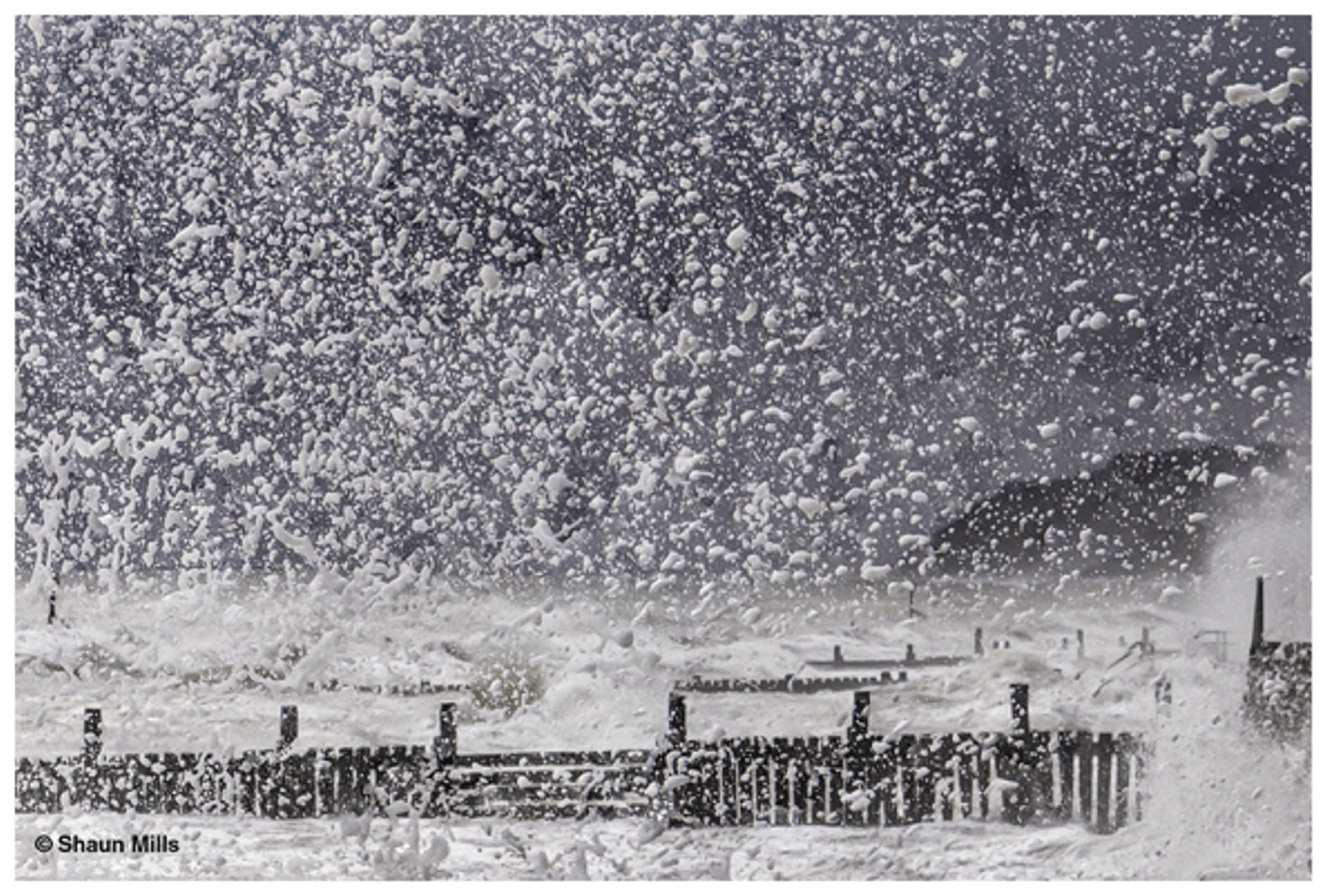 “During a storm on Britain’s east coast, waves crash against the sea defenses at Overstrand, Norfolk, sending sea spray high into the air. Photographer Shaun Mills writes: ‘A photo trip to the Norfolk coast coincided with a storm, and I took the opportunity to capture some incredibly rough seas. The image was taken to isolate the individual spray, giving the impression of a snowstorm.’