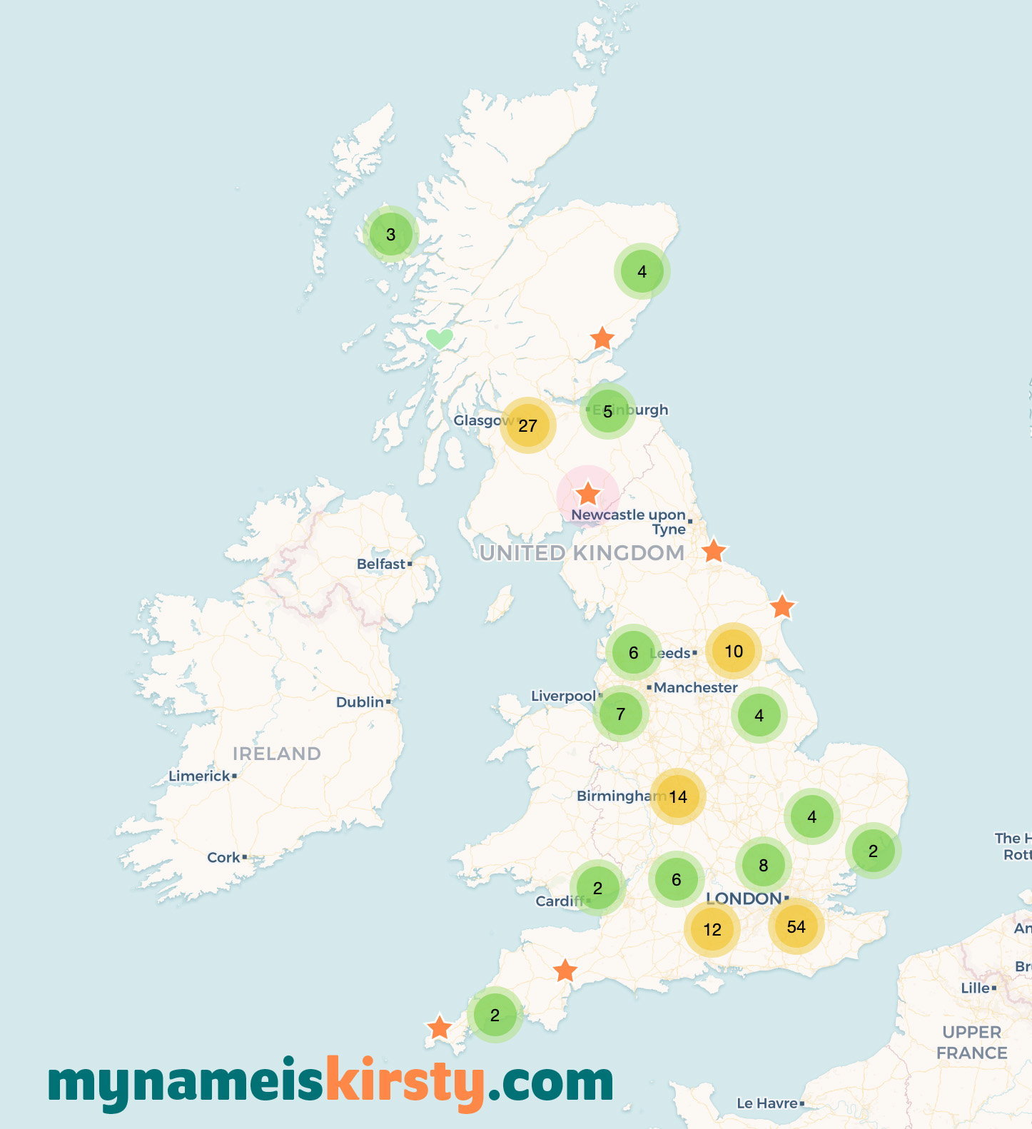 As of April 6, the fundraiser hit $5,690 and 336 total names have joined — mostly in the U.K., but there are also participants in Australia, New Zealand, Italy, Malaysia, and the U.S. And the map’s entries are particularly impressive considering how rare the name is: In the U.S., for example, there are likely only 945 Kirstys, according to the website How Many of Me.