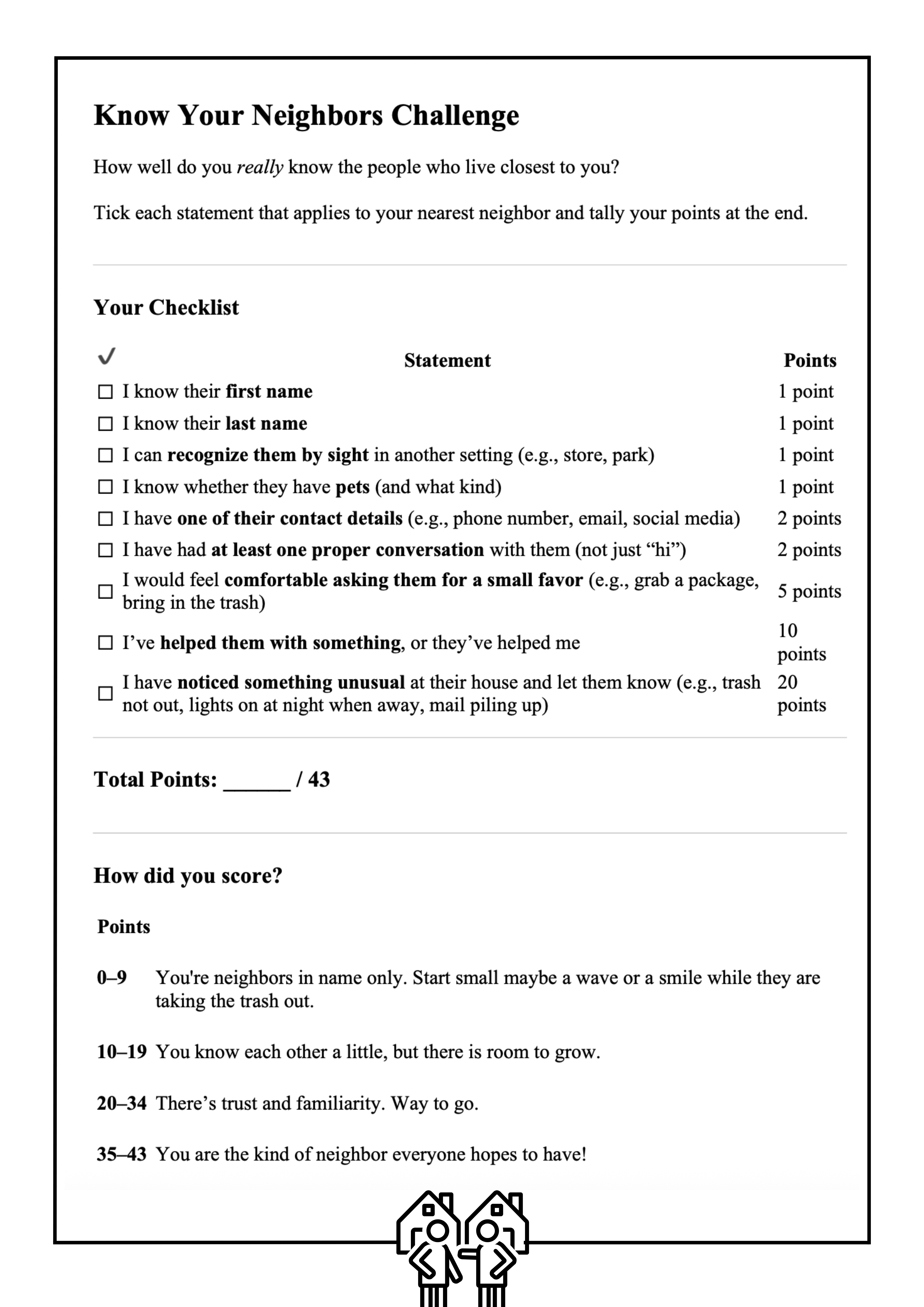 Allen has written extensively on the topic, and she created a Know Your Neighbors challenge (which you can download for free). “Social connection and a sense of belonging to a community or neighborhood helps with feelings of safety and alleviates isolation,” she explained. “This has important implications for mental health. Even light neighborly contact is beneficial (providing it is positive!).”