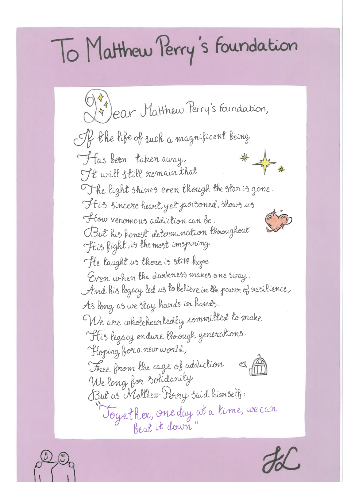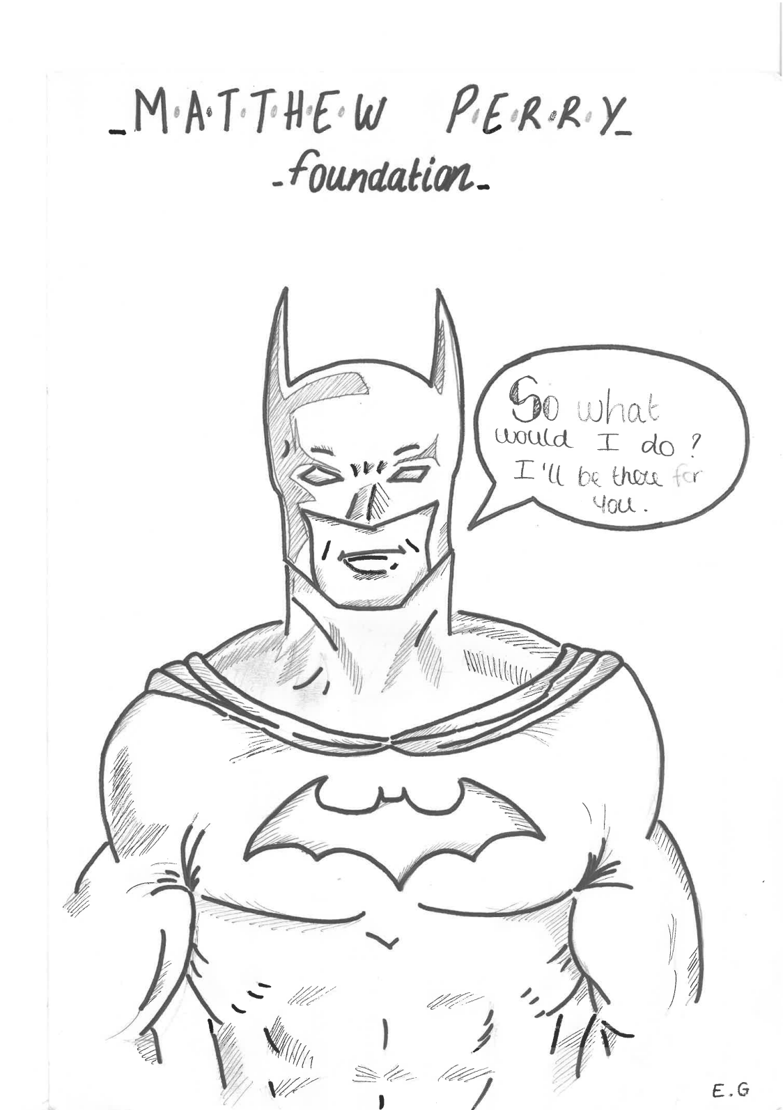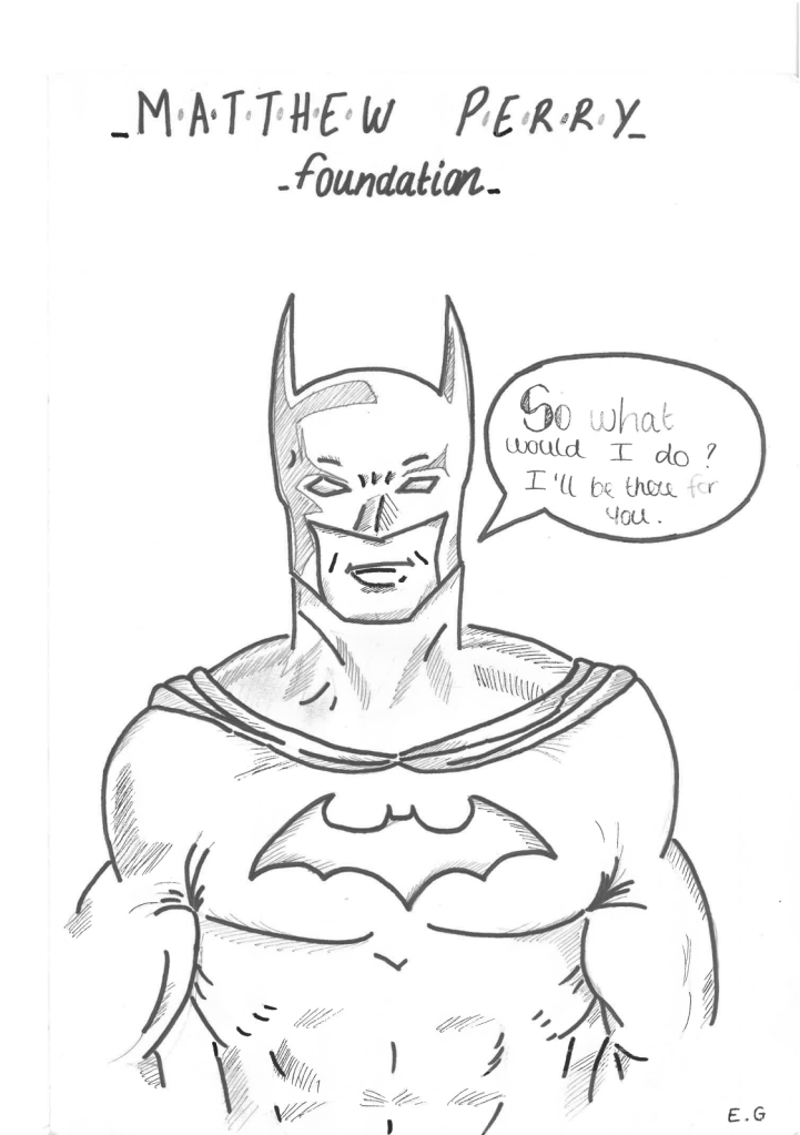 These messages hit home in Morin’s classroom. She instructed her students to create a piece of work — such as a letter, poem, or drawing — either paying tribute to Perry or illustrating how they could help combat addiction. And the teenagers delivered. Eva drew a sketch of Batman, a character Perry famously felt connected to, who simultaneously answered the prompt and referenced Friends by saying in a text bubble: “So what would I do? I’ll be there for you.”