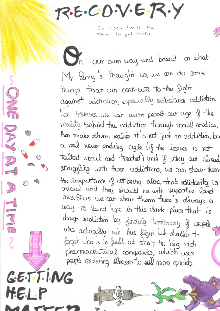 Another student, Soraya Cassandre, detailed her thoughts in an illustrated page with the words “One day at a time,” an Alcoholics Anonymous motto, in the margin. “We can warn people our age of the reality behind the addiction through social medias, then make them realize it’s not just an addiction, but a real never-ending cycle (if the issues is not talked about and treated),” she wrote, “and if they are already struggling with those addictions, we can show them the importance of not being alone, that solidarity is crucial.”