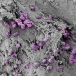 “A microneedle patch developed by the Hammond and Irvine Labs non-invasively samples biomarkers and immune cell populations in skin. By analyzing the cells and surrounding tissue, researchers aim to classify the immune signatures of various disease stages, including autoimmune skin conditions and hard to detect ovarian cancers. Highlighted here are immune cells (colored purple to represent gender equity and women’s health) collected by the needles’ seaweed-based coating (gray). The device is now being used in preclinical and clinical settings on three continents.”