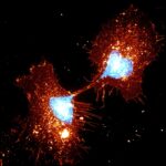 “The Manalis Lab studies the mechanical and biophysical changes that occur during cell division. In this experiment, researchers track the organization of the plasma membrane (red/yellow) as a live human adenocarcinoma cell divides in two. A lingering plasma bridge (center) contains remnants of DNA (blue) that failed to separate between the daughter cells. Such segregation errors can result in mutations that can initiate and drive cancer. Understanding how plasma membrane movement is regulated as normal and cancer cells divide could help explain how mutations arise and how to prevent them.”
