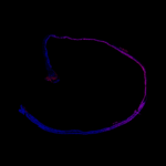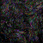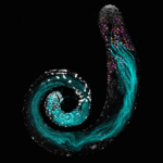 “During development, Drosophila germ cells undergo incredible morphological changes to produce some of the longest sperm in the animal kingdom, ~2mm. In this fly testis, nuclei are marked in white. Germ cells begin their journey as stem cells (at the top). Continued division and maturation push cells away from this origin, eventually yielding mature sperm, shown in cyan. In between, magenta and yellow mark expression of RNAs essential for sperm development. The Yamashita Lab studies how every stage of germ cell development works together to ensure continued fertility from generation to generation.”