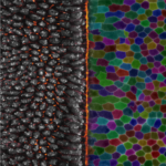 “As an organism transforms from a simple collection of cells into a complex system of life, the developing tissue undergoes extensive remodeling. The Martin Lab uses fruit fly embryos to study the impact of mechanical forces on cell behavior. On the left, nuclei in gray are linked by new cell junctures, marked in orange. The view on the right maps cell boundaries with randomly assigned colors to track them as they evolve. At center, a newly formed structure fold pulls the two sides inward. Collectively, these perspectives paint a dynamic picture of a cellular community working together to shape the organism.”