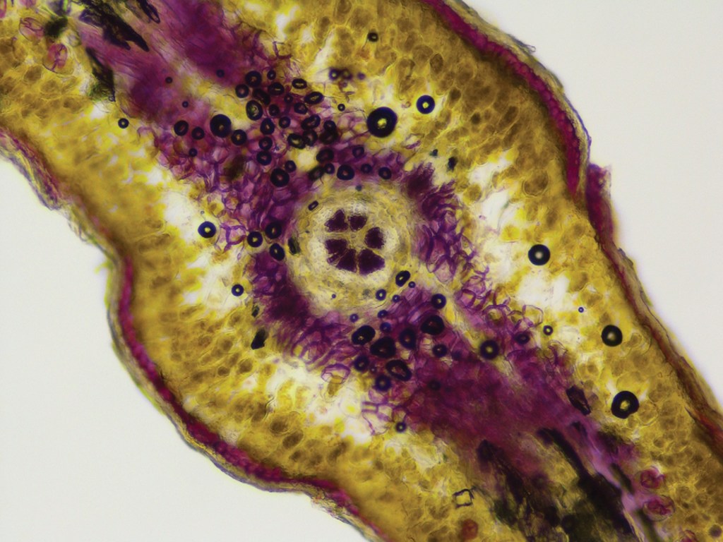“In cross section, the scaly leaves of the Northern white cedar tree are a world of complexity. Cells and cell walls containing stiffening lignin are stained purple, giving researchers the contrast they need to study structures called transfusion tracheids, and how differences in their anatomy make the leaves more or less efficient at moving water.”