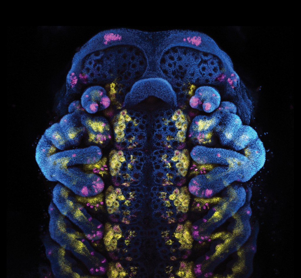 “This teddy bear won’t be cuddly for long. It’s the embryo of an Arizona bark scorpion. Spots of color map the expression of two different copies a gene that play an important role in nervous system development. The separate expression patterns show researchers how the respective copies’ functions have diverged over millions of years of evolution.”