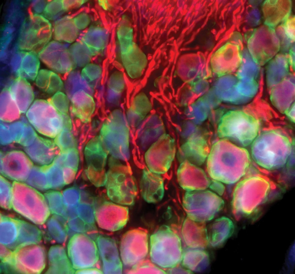 “A bundle of mouse nerve cells (with different types differentiated by color) are wrapped in the green of signal-regulating cells called satellite glia. In mammals, bundled neurons like these carry signals from the red cells, called axons, of the extended nervous system to the brain.”
