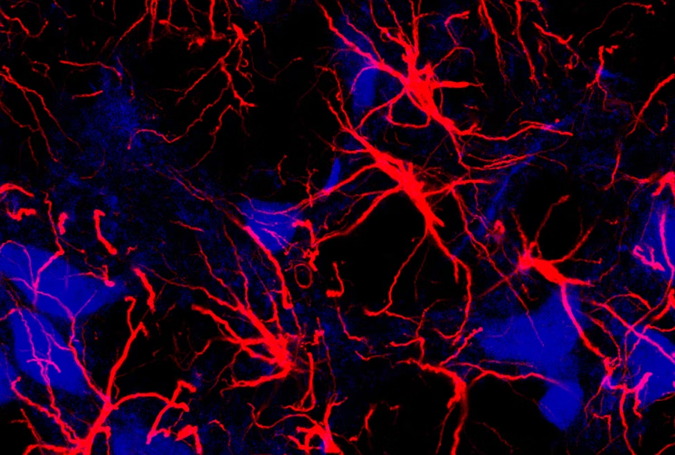 Astrocytes (red) in a rat’s brain